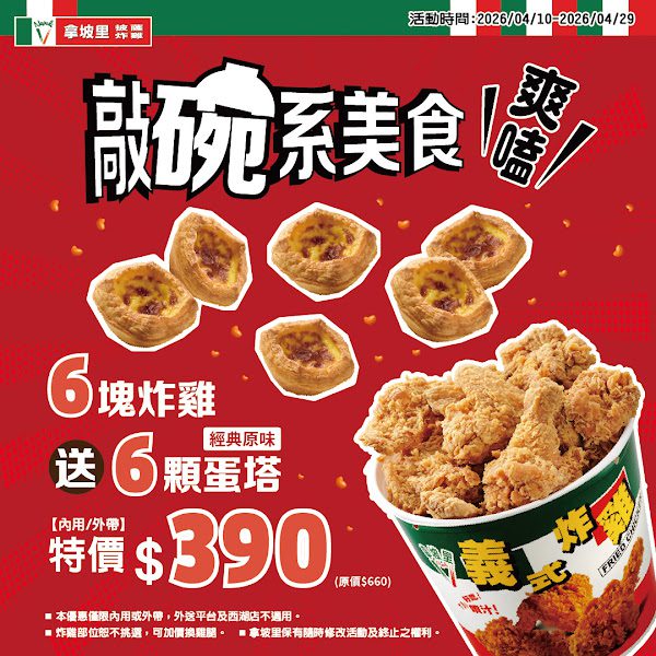 (6塊炸雞送6顆蛋塔金黃酥脆炸雞搭配經典原味蛋塔外酥內滑鹹甜一次滿足原價660元 外帶/內用特惠價390元)