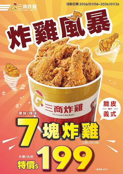 (三商炸雞 外帶7塊炸雞 原價455元 特價199元 開年主打優惠 酥香炸雞份量實在)