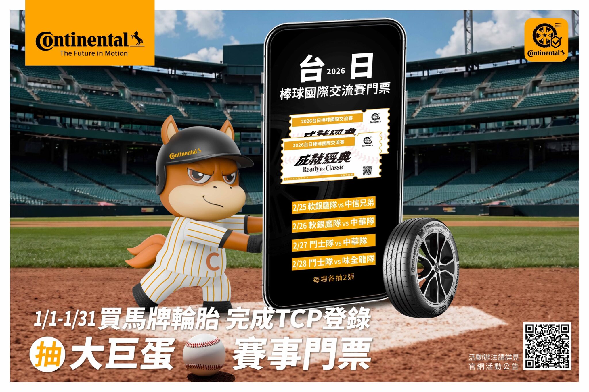 透過『Continental 馬牌會員中心Total Confidence Plan (TCP) App』,車主只需掃描新胎條碼即可註冊,輕鬆掌握保固資訊、優惠活動與定位服務,享受數位化帶來的便利與安心。透過數位化平台,即可輕鬆掌握售後服務、保固資訊、優惠活動與定位服務,快速找到鄰近經銷商並獲得即時支援,還會推送最新資訊與專屬優惠,讓輪胎相關事宜變得輕鬆無憂,專注享受馬牌輪胎帶來的流暢駕馭與全面守護。凡於 2026 年 1 月 1 日至 1 月 31 日期間,購買馬牌輪胎並加入 TCP App 完成登錄,即可加碼抽 2026 台日棒球國際交流賽門票,登上大巨蛋,一起為中華隊應援!