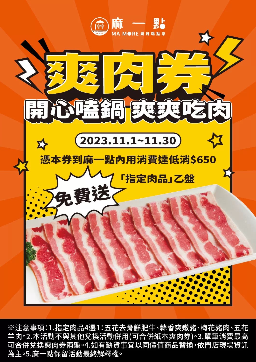 (1)周年慶免費送:內用消費出示「電子爽肉券」圖片,指定肉盤免費送。(2)壽星生日禮:11月壽星平日週一至週五內用結帳金額滿2000元,出示證件招待「憤怒鳥蛋」,祝你「蛋」生日快樂。(3)週年慶滿額送:平日週一至週五內用結帳金額滿$2000元,現場抽加送創意菜色魔芋脆脆與手工魚丸等招牌好料。(4)揪團開鍋禮:晚餐時段17到22點揪團7人以上用餐,抽超浮誇「巨無霸毛肚」免費招待(價值$1500)。(5) 飲品第2杯半價:消費三味鍋加點飲品享「第2杯半價」優惠。