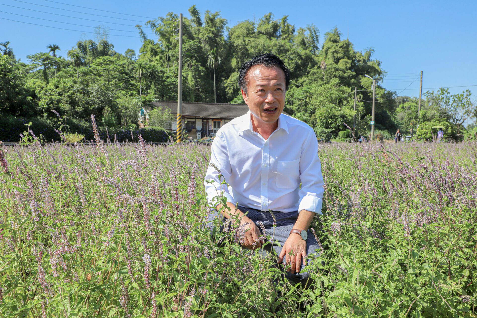 嘉義水上仙草柔軟節4日登場,嘉義縣長翁章梁前往紫色山城仙草花田參訪市集,漫步在紫色花海中,並大啖仙草雞湯與仙草碗粿,直呼水上鄉的仙草美食有特色又好吃。