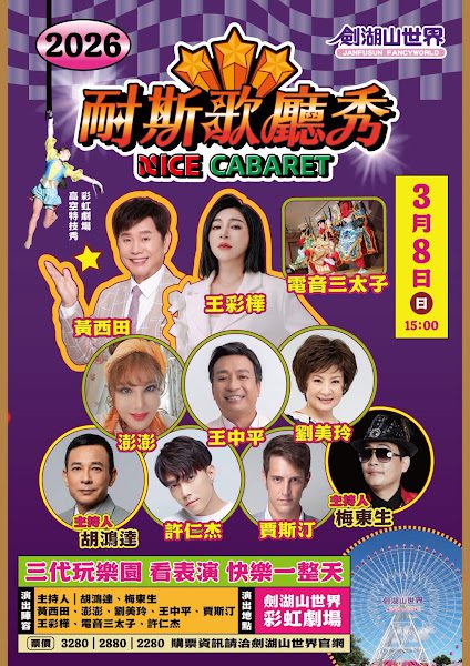 【WoWoNews】跨越時空的歌廳秀盛宴,婦女節登場!歌廳秀原味再現《耐斯歌廳秀》3月8日起連著三個月,每月一場在劍湖山世界的彩虹劇場,15組藝人齊聚歡唱,一張票在劍湖山一日遊,原味歌廳秀,從「台灣濱崎步」到「不老歌王」還有「台灣脫口秀始祖」等華麗陣容,滿足長輩們的懷舊情結,也讓年輕一代有機會親身體驗台灣最道地的「秀場文化」,而「樂園+歌廳秀」雙重享受,正是今年春天最受矚目的亮點體驗!