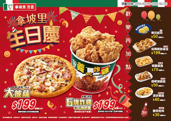 拿坡里2026生日慶熱鬧登場!迎戰WBC熱潮 大披薩、六塊炸雞通通199元