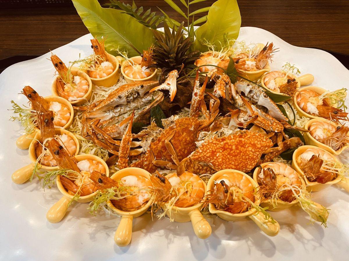 A:餐廳針對歲末年歡提供 8,000 元與 10,000 元(每桌)兩種價位選擇。菜色包含「龍蝦沙拉綜合拼盤」、「陶板鹽焗活鮑魚」與「鮮蟳芋香米粉鍋」等精緻料理;高階價位更涵蓋「大活生蠔」、「蒜泥蒸龍蝦」及「麻油松阪豬雞腰腰子」,展現豐盛且紮實的宜蘭企業尾牙辦桌誠意。