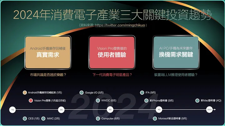 有地表最強蘋果分析師名號的郭明錤,25日在X平台發布明年「消費電子產業三大關鍵投資趨勢報告」,其中提到頭戴裝置「Vision Pro」將會是蘋果在2024年最重要的產品,並推測最快在1月底就將開始發售。