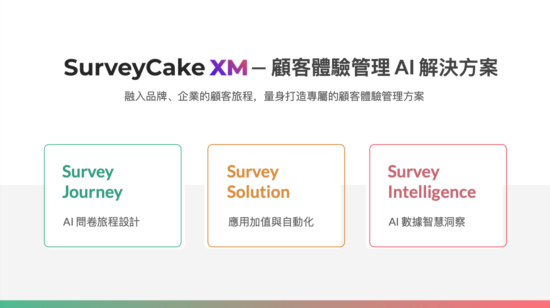 SurveyCake XM 顧客體驗管理 AI 解決方案之三大功能。圖/新芽網路提供