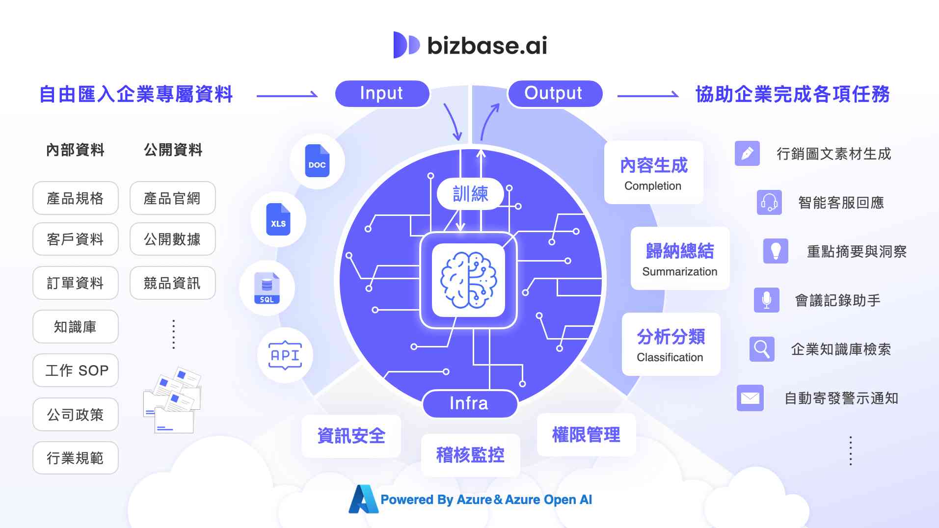 提到今年 AI 相關熱門話題,「生成式 AI」絕對是榜上有名。新芽網路的第二個 AI 產品「Bizbase.ai 企業 AI 基地」正是運用了生成式 AI 的優勢,致力於為企業打造堅實的 AI 基地以迎接 AI 時代的挑戰與商機。企業能夠輸入、串接內外部資料,建立完整知識庫,再透過 AI 生成具備公司知識之文字回應、視覺化數據洞察、語音內容分析等多元應用,可說是「企業專屬ChatGPT」。