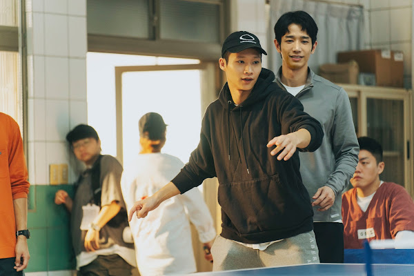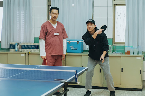 (施名帥(左)延續先前在《乒乓男孩》魔鬼教練形象,被劇組巧妙翻玩成監所乒乓高手,在現場再次展現扎實底子。右為陳澤耀。(愛奇藝國際版、壹壹影業提供))