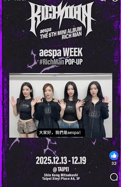 近期以新專輯 《Rich Man》回歸的 韓國超人氣女團 aespa人氣銳不可擋, 日前在2025 MAMA award勇奪「最佳編舞」、「最佳舞蹈表演女團」和「最佳女團」成為三冠王的她們再次締造亮眼佳績的同時,並趁勢以專輯名稱於世界各城市推出 主題快閃店【aespa WEEK #RichMan POP-UP STORE】成功帶動話題熱潮,在歌迷聲聲喚下, 將於12月13日-12/19日登陸台北,在台北新光三越A8 3樓展開為時一周的快閃活動。為此心繫台粉的aespa在開展倒數兩周特別跨海遞出「邀請函」,以獻聲錄製影片方式號召歌迷,只見影片上四位團員以親切話語問候歌迷,並以一人一句方式向歌迷介紹此次主題快閃店「亮點」;其中團員Giselle、 Winter、 Ningning依序說到:「 aespa WEEK #RichMan 快閃正式登陸台北,這次也準備了以Rich Man專輯為靈感打造的特別空間,不僅有Rich Man原創MD(周邊商品),還準備了新的特別MD!」而隊長Katrina則表示:「接下來還會有更多消息, MY們一定要多多期待!」四人在影片尾末不忘向歌迷喊話:「那我們再快閃店見吧,再見!」一連串真摯又充滿活力的問候,讓粉絲們瞬間燃起期待值,勢必將在開展日掀起熱潮,為歲末的台北注入最炙熱的aespa能量。