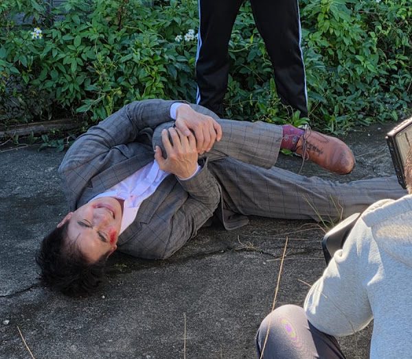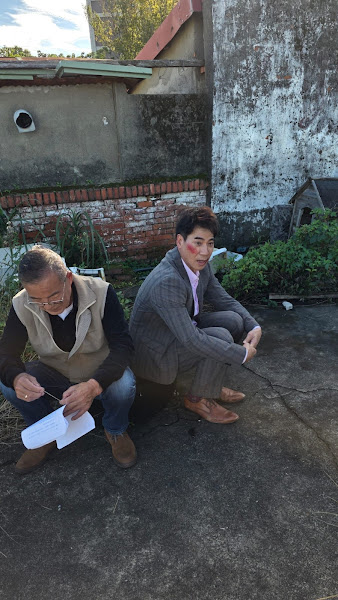 (照片:民視提供/翁家明(右)拍攝打鬥戲後,服裝、鞋子滿是磨痕,與龍天翔(左)在一旁休息)