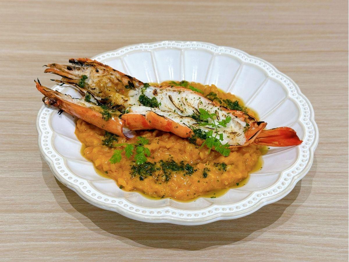 最先被驚豔的正是店內的義式料理。由主理人親自掌控火侯的「貝殼花園海膽大利麵」,以多種貝類釋出的鮮甜為主軸,海膽香氣隨蒸氣微微上升,層次明亮而清爽;而「炙烤大虎蝦蝦膏燉飯」則以溫潤奶香包裹米飯,濃郁蝦膏與檸檬香草油交織出濃郁卻不厚重的口感,是許多老客人一吃上癮的經典款。