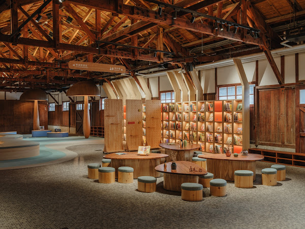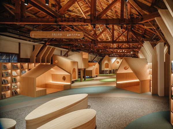 (「繪本故事屋」設計保留建物木屋架的質地與歲月痕跡,以自然意象回應場域記憶,包含森林般的木質層層框架、流動如水景的動線、樹洞與小屋般的閱讀角落。)