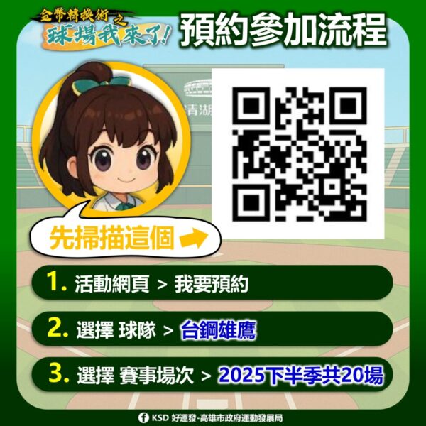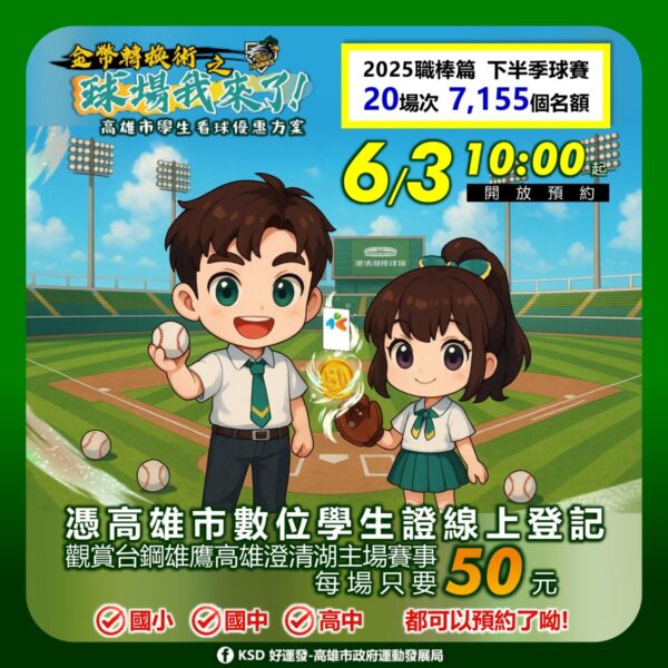 高雄市政府推出的「高雄市學生50元看球」方案,優惠對象首度納入國小生!不只國中、高中,現在國小生也能直接用數位學生證線上預約台鋼雄鷹澄清湖主場賽事了!凡持有一卡通數位學生證者,皆可於明(3)日上午10時起透過線上平台預約職棒下半季台鋼雄鷹在澄清湖棒球場的主場賽事,超值銅板價每場只要50元,共開放20場次賽事,提供7,155個名額,每位學生可預約最多5場,每場入場票價僅需新台幣50元,遠低於原價300至400元的票價,讓高雄市的學子能以銅板價輕鬆體驗職業棒球賽事現場的熱血氛圍。