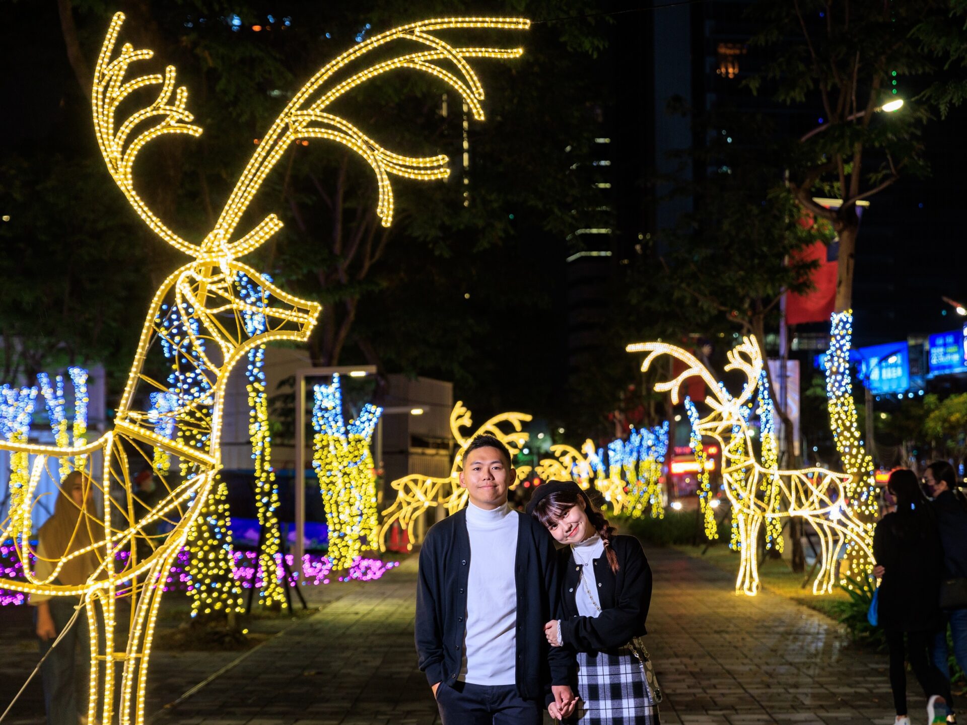 新北市觀旅局說明,今年新北歡樂耶誕城在市民廣場周邊打造四條祈福大道,分別是中山路人行道上的「天使祝福大道」,以傳遞節慶喜願的天使妝點街頭,吹奏著樂曲。接著縣民大道人行道上的「幸福花鹿大道」,以立體馴鹿造型搭配暖黃色深淺的霓虹燈飾,刻畫出耶誕節暖心場景。