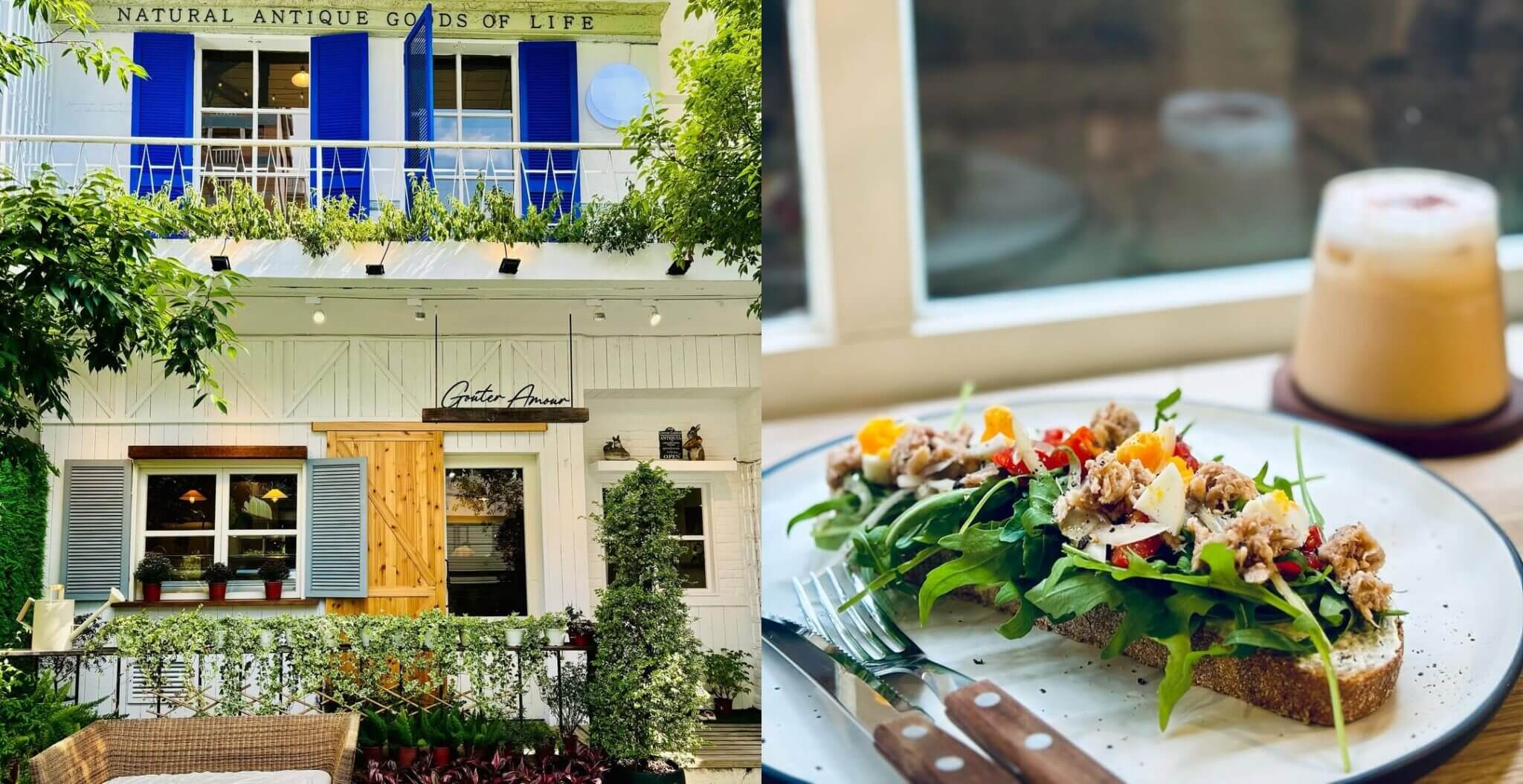 於八月正式開始營運的咖啡廳「Goûter Amour」,店名取自法文的下午茶與愛兩個字,店外的植栽搭配店內的擺飾,營造出悠閒的鄉村風格。餐點有開放式三明治、鄉村爐火餐盤等系列可以選擇,另外飲品部分也有鄉村茶、義式咖啡、氣泡飲等多種選擇。「Goûter Amour」就在台中國美館附近,可以在用餐前後去觀賞展覽,順便探索附近的街區!