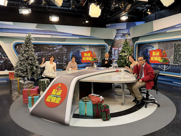 (《聖誕綻情室》單元由郭子乾(左3)、唐從聖(右1)扮演的「寒國魚」「李嗷」回歸,並特邀個黨派黃瀞瑩市議員(左1)、徐巧芯立委(左2)、戴瑋珊市議員(右2)共譜平安夜樂章(圖_TVBS))
