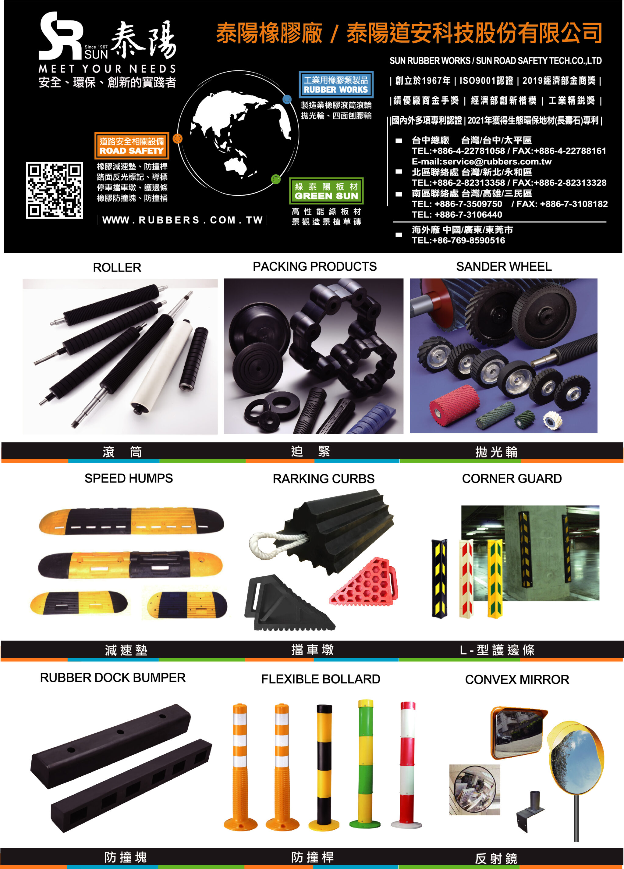 泰陽道安科技的產品線涵蓋防撞桿、擋車墩、橡膠滾輪、液態矽膠輪、反光設施等道路安全設備,並提供從製造、行銷、銷售、出貨到售後服務的一站式流程管理。企業同時取得 ISO 9001 品質管理與 ISO 14001 環境管理等國際認證,使產品在效率、安全與環境責任之間取得平衡,並獲得國內外合作夥伴的長期信賴。