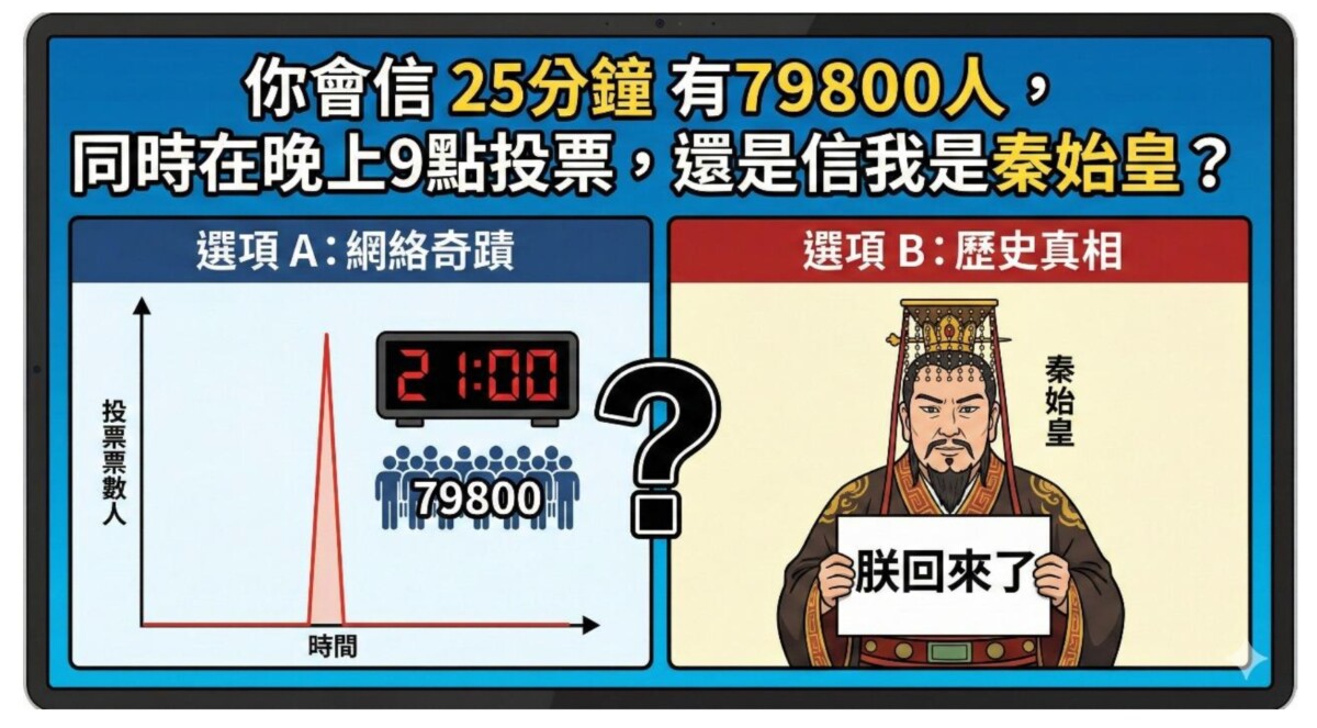 買網軍、假民調的技術手段,已經進化到真假難分的地步,可透過自動化腳本與龐大的帳號IP池,在2026新竹市長民調作假上,展示了驚人的火力,在短短的 25分鐘內,狂灌 79,800票。