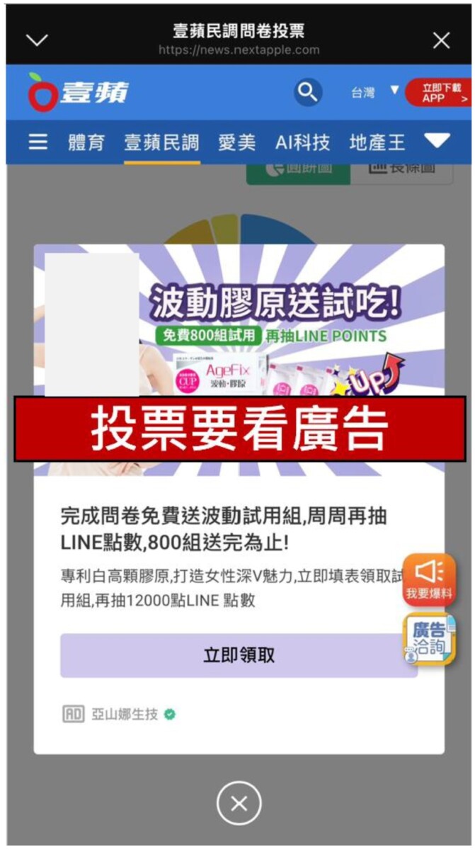 隨著總票數暴增,平台的流量收益也水漲船高,我們實測發現,每次要進行投票前,都會出現廣告,若以平均單次(CPC)點擊20元 這個數字來預估: