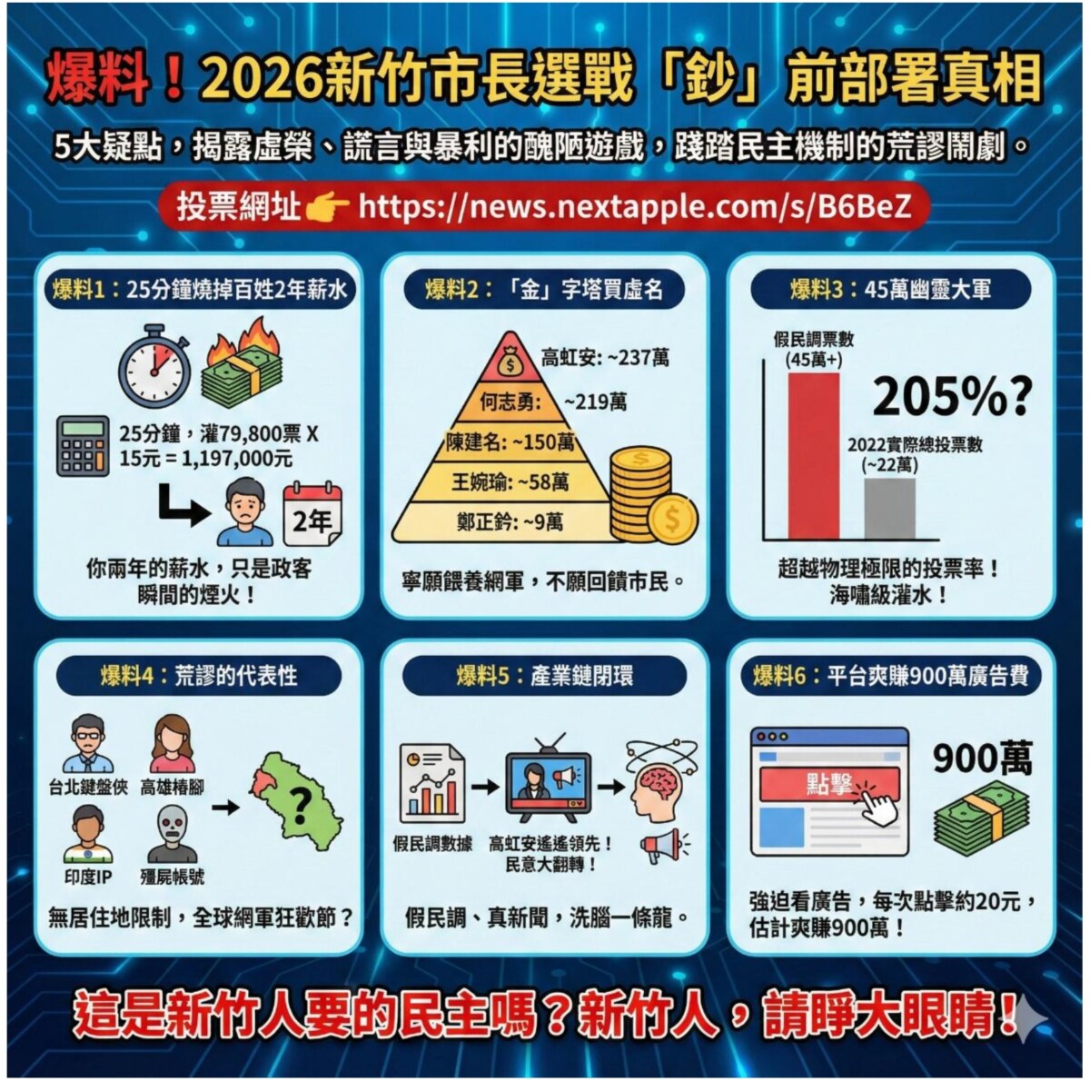 有圖爆料!2026新竹市長「鈔」前部署?民調灌水一票15元,25分鐘燒掉百姓2年血汗錢?